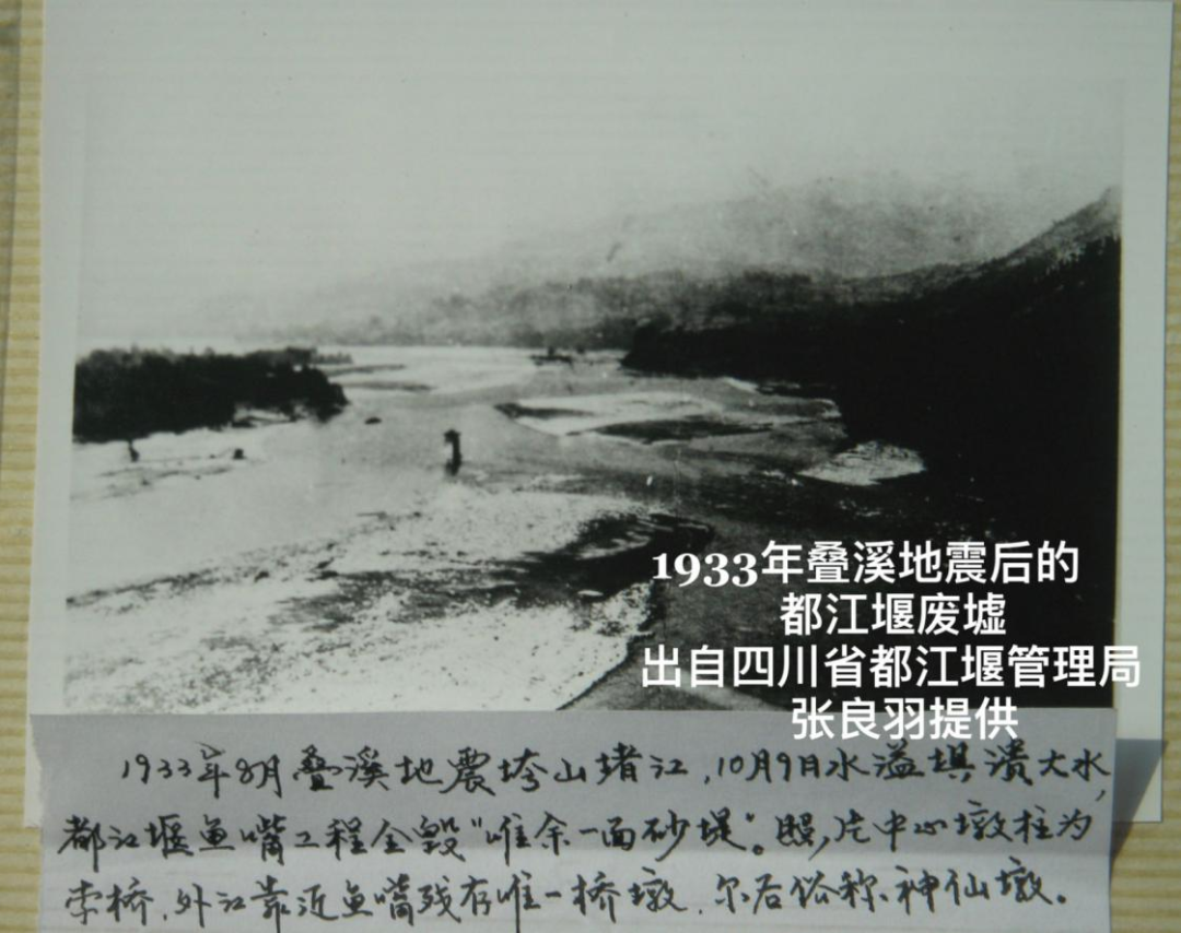 1933年叠溪地震后的都江堰渠首荡然无存,江心处是残存的唯一桥墩(尔后俗称“神仙墩”)(四川省都江堰管理局供稿)